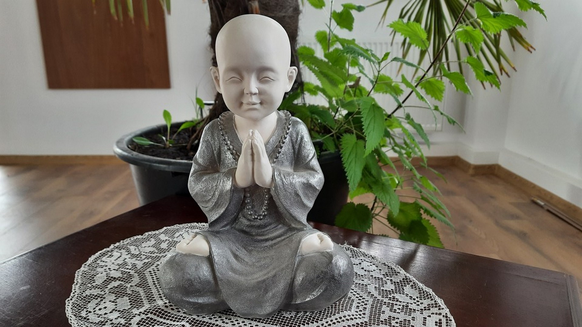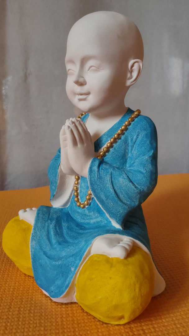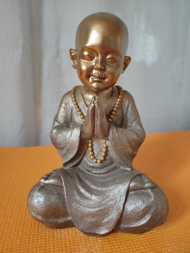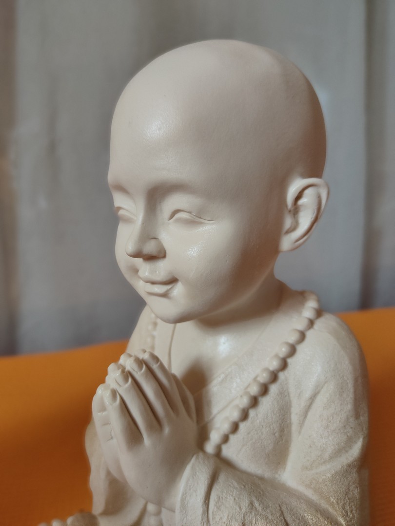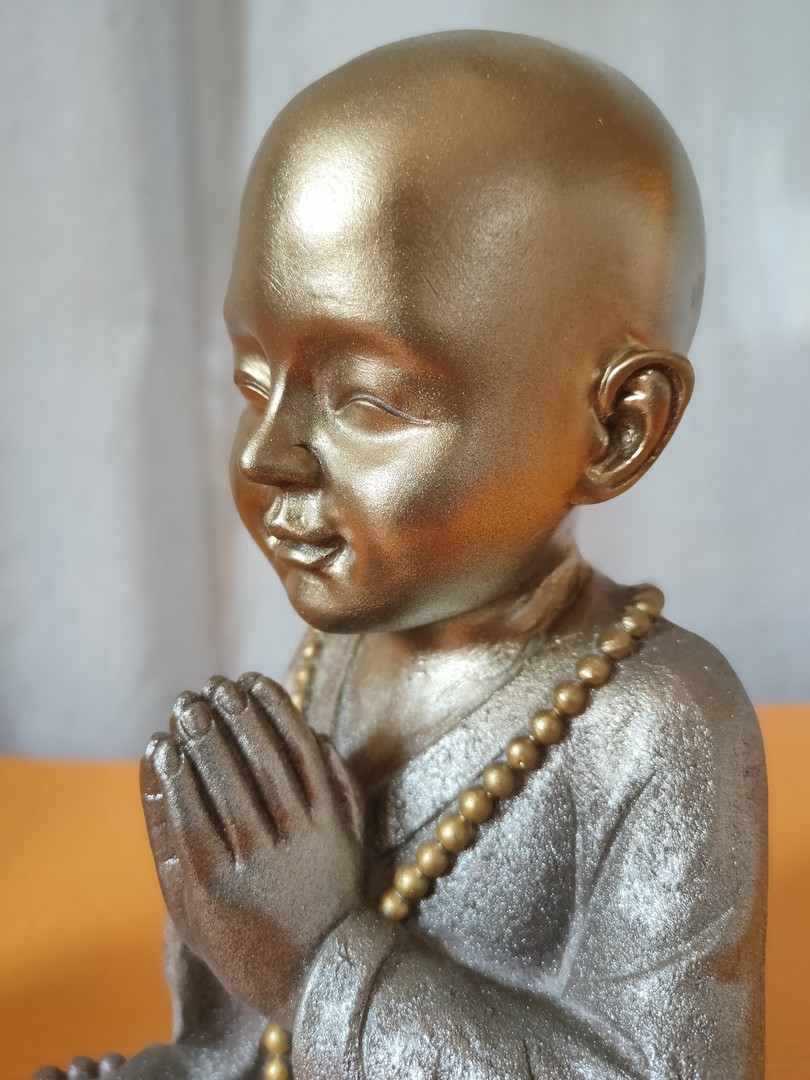 - Statuia reprezintă un ”mic” călugăr care este așezat în postura Lotusului (Padmasana). Palmele lipite sunt aduse la piept realizând (Anjali Mudra – gestul rugăciunii).