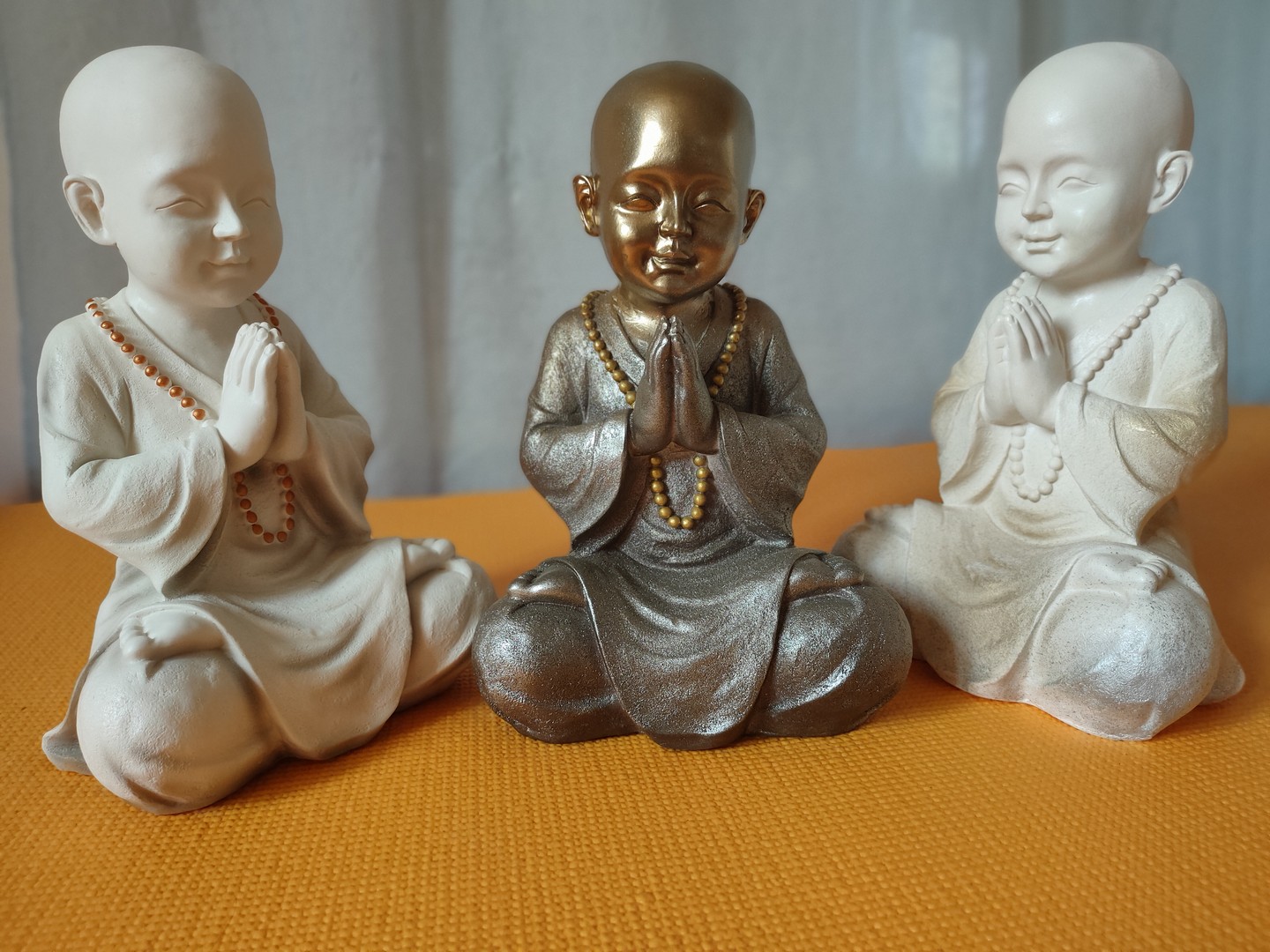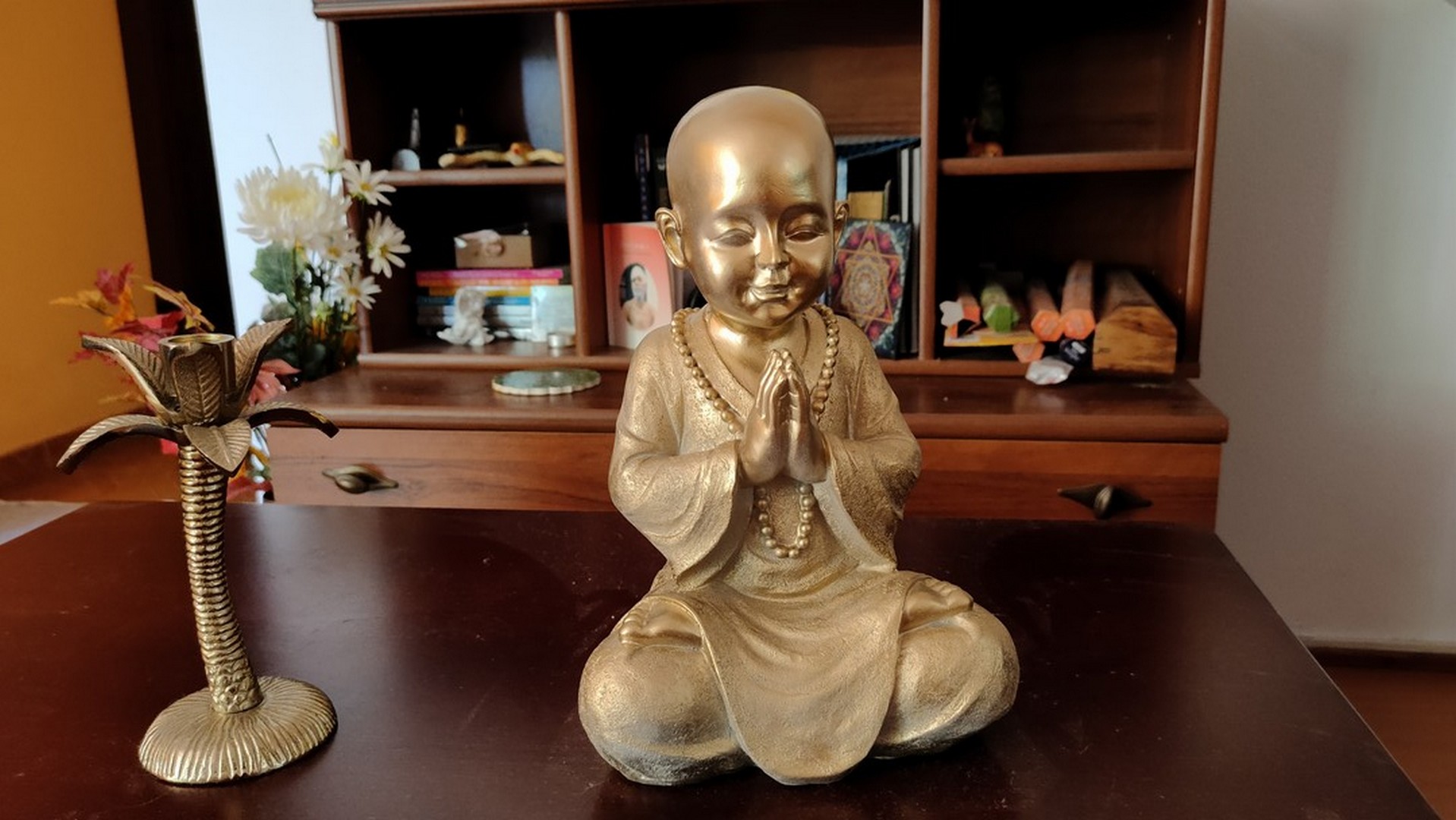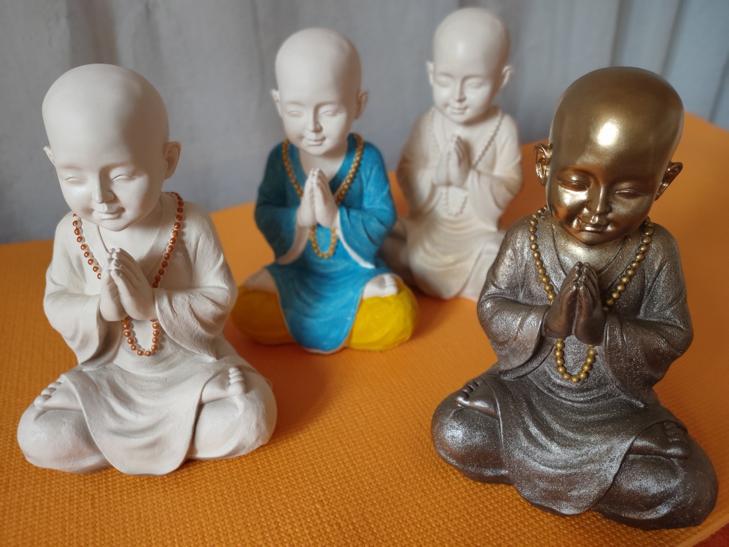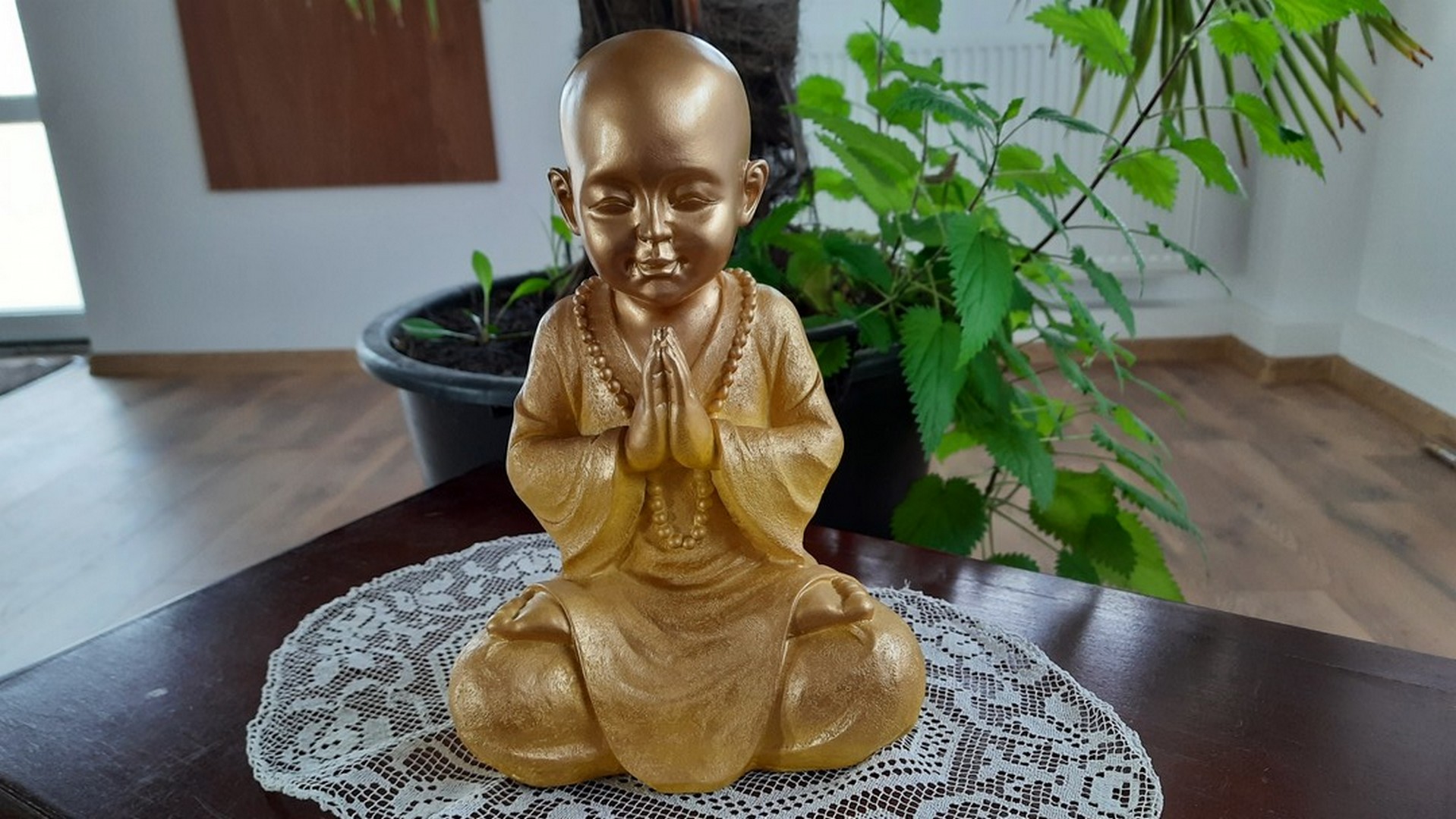- Statuia reprezintă un ”mic” călugăr care este așezat în postura Lotusului (Padmasana). Palmele lipite sunt aduse la piept realizând (Anjali Mudra – gestul rugăciunii).