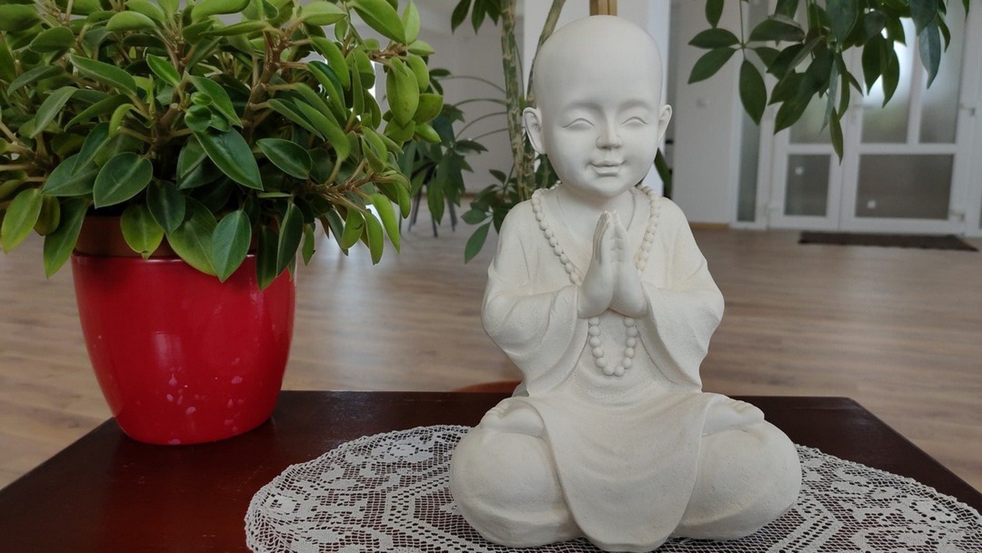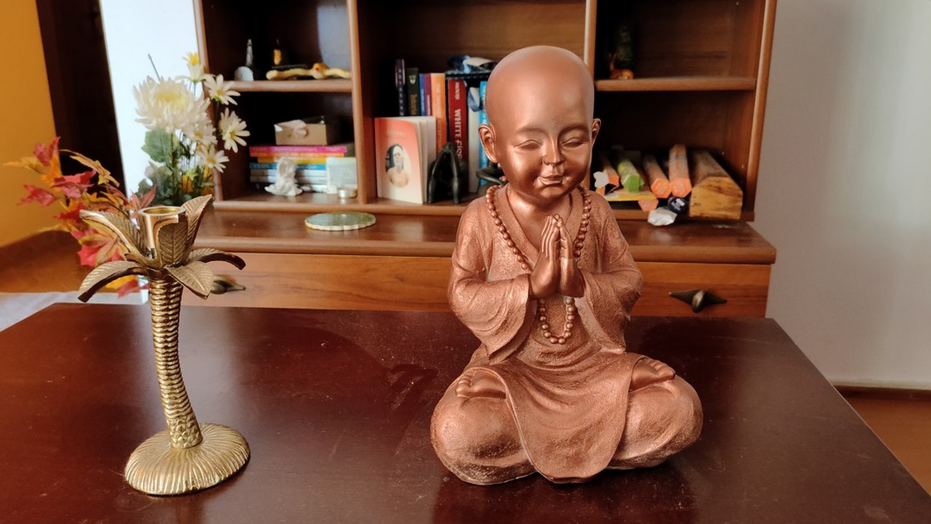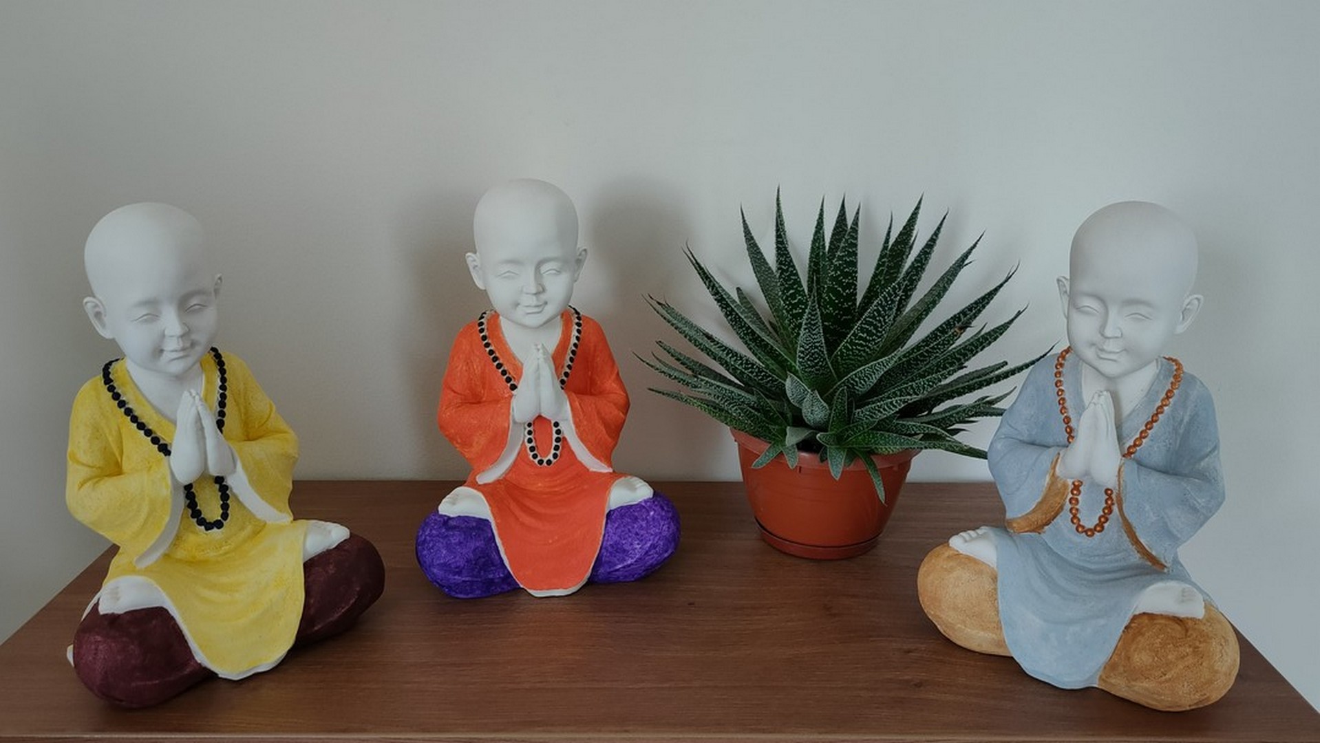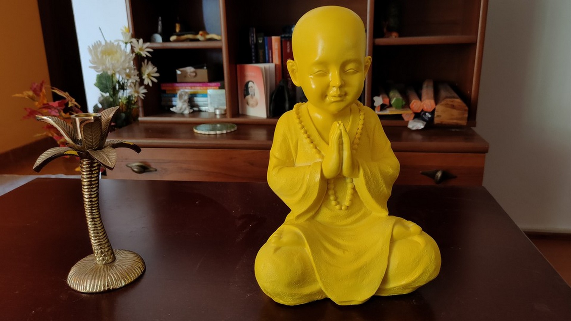 - Statuia reprezintă un ”mic” călugăr care este așezat în postura Lotusului (Padmasana). Palmele lipite sunt aduse la piept realizând (Anjali Mudra – gestul rugăciunii).