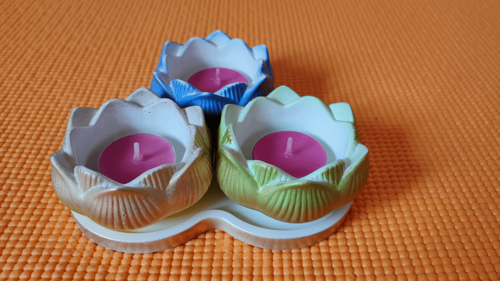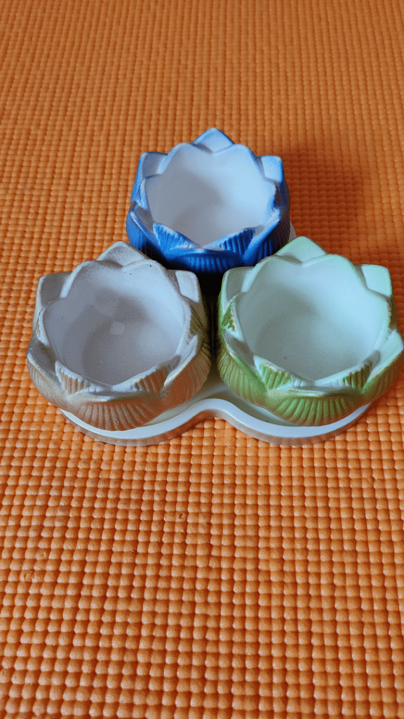 - Este un suport frumos de lumânare compus din 3 lotuși mici diferit colorați, dispuși pe o tăviță.
