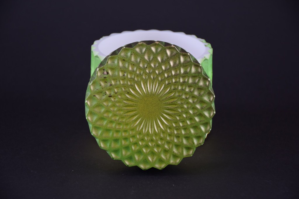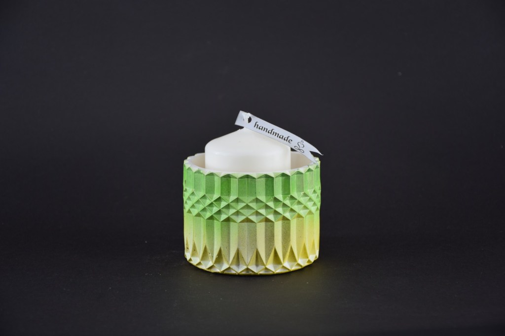 - Este un suport pentru lumânări mai mari în formă de cilindru cu mai multe ornamente geometrice regulate.