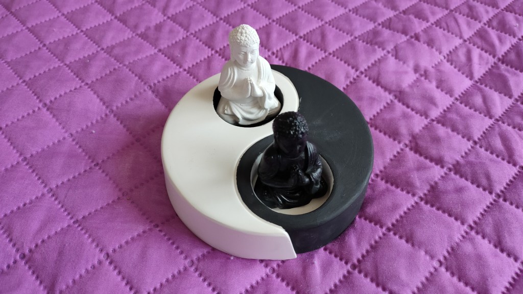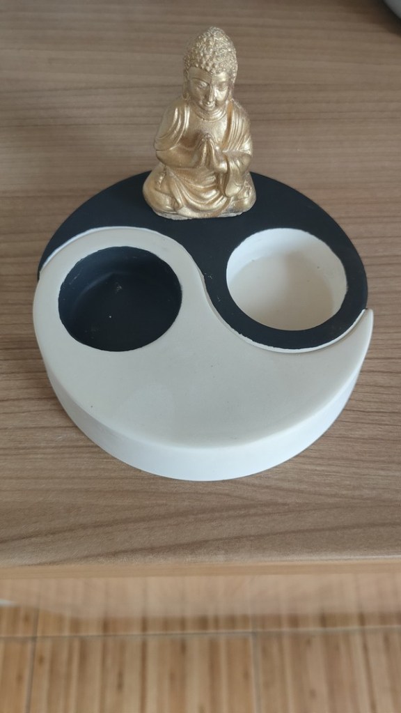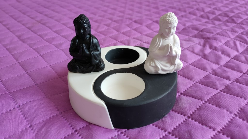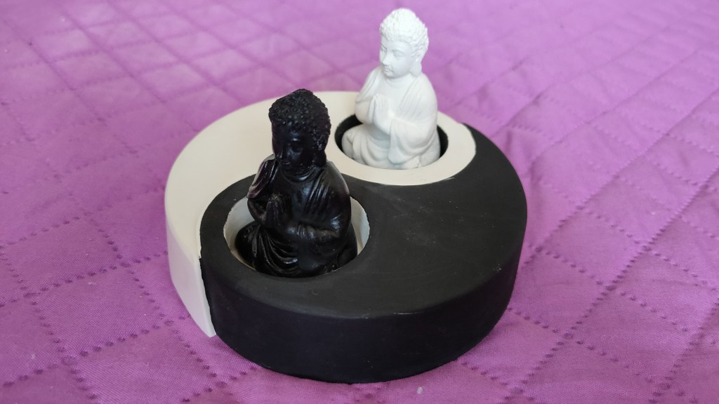 - Se pot pune astfel 2 lumânări cea albă în lăcașul negru și cea albă în lăcașul alb. Noi am plasat, ca diversitate, două mici figurine reprezentându-l pe Buddha, colorate în alb și negru.